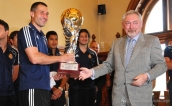 Zanim piłkarze Wisły pojechali na rozdanie medali do Warszawy odwiedzili krakowski magistrat. Tam czekał na nich prezydent Krakowa, Jacek Majchrowski, z pamiątkowym pucharem za zdobycie Mistrzostwa Polski dla drużyny Białej Gwiazdy. » -
