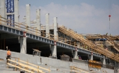 Budowa trybuny zachodniej nadal postępuje w bardzo szybkim tempie. Ledwo co skończyło się układanie rzędów trybuny na jej pierwszym piętrze, a już w górę idą belki, na których wsparte zostanie drugie piętro trybuny. » -