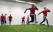 Środowe przedpołudnie zawodnicy Wisły spędzili w głównej mierze na trybunie zachodniej. Drużyna po raz pierwszy wykorzystała położone tuż obok jej szatni w tej części stadionu pomieszczenie do rozgrzewki. »