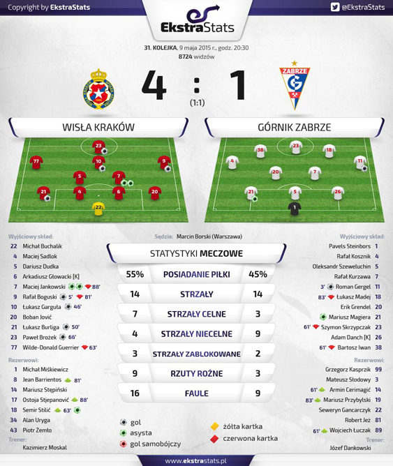 Data publikacji: 10-05-2015 12:01Piłkarze Wisły Kraków pewnie pokonali w sobotni wieczór Górnik Zabrze. Pomeczowe statystki pokazują, że podopieczni Kazimierza Moskala zasłużenie wygrali z zespołem Józefa Dankowskiego.