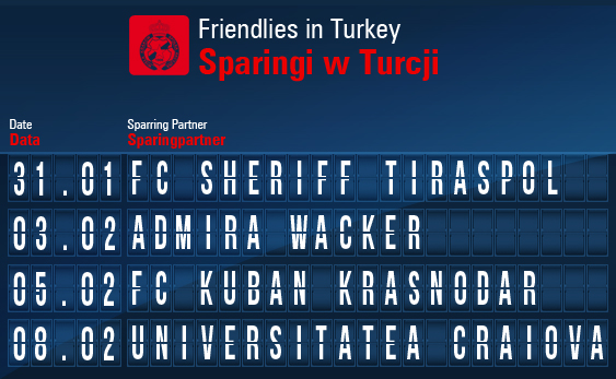 Na Riwierę Turecką podopieczni Franciszka Smudy udadzą się 29 stycznia i przebywać tam będą do 10 lutego. Początkowo planowano, że 3 lutego odbędzie się sparing z kazachskim FK Aktöbe, lecz drużyna ta postanowiła zrezygnować ze zgrupowania w Turcji. Zamiast meczu z byłym przeciwnikiem Legii Warszawa w Lidze Europy Biała Gwiazda rozegra kontrolne spotkanie z Admirą Wacker - 9. drużyną austriackiej Bundesligi.