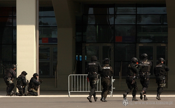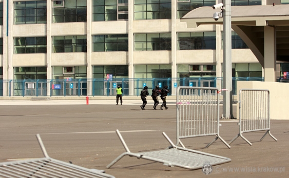 Na parkingu przed trybuną zachodnią wylądowały dwa helikoptery, z których błyskawicznie wyskakiwali antyterroryści, a następnie przemieszczali się w kierunku wejścia na stadion.