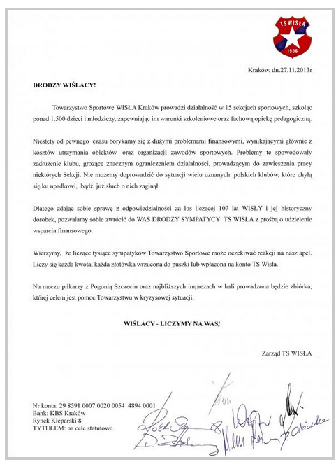 Data publikacji: 03-12-2013 19:58Zwracamy się z gorącym apelem do wszystkich sympatyków Białej Gwiazdy o wsparcie działalności TS Wisła Kraków. Na meczu z Pogonią Szczecin prowadzona będzie na stadionie zbiórka pieniędzy, która ma na celu zebranie środków finansowych na działność Towarzystwa Sportowego!