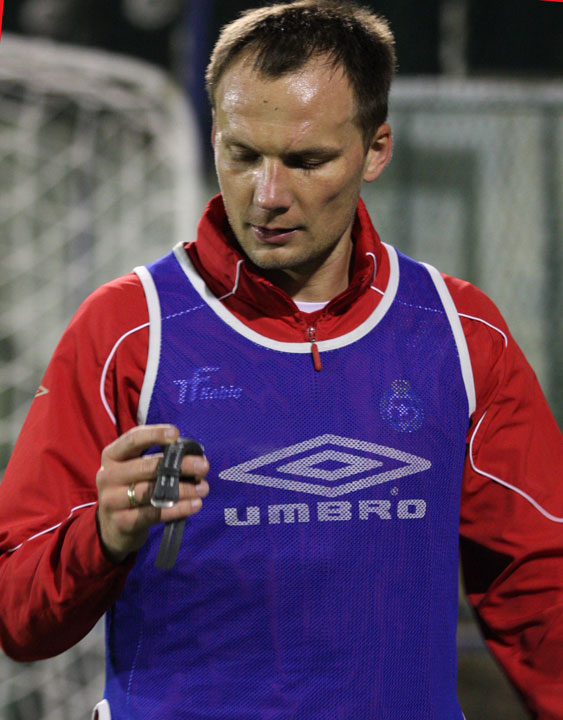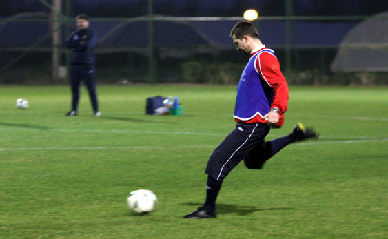 Po południu drużynie został zaaplikowany typowo piłkarski trening. O ile rano zawodnicy rozpoczęli zajęcia od fitnesu, potem korzystali z siłowni, a na boisku z zajęć typowo piłkarskich zawodnicy mieli tylko grę w dziadka, tym razem prawie w ogóle nie rozstawali się z piłkami. Z piłkami była rozgrzewka, z piłkami były zajęcia taktyczne, trening wreszcie zakończyła gierka. Tą wygrali „żółci” po trafieniu głową Rafała Boguskiego.