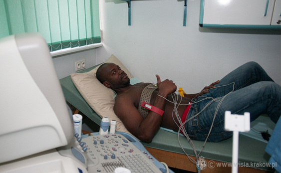 Dzisiaj na Oddziale Klinicznym Chorób Serca i Naczyń, w pracowni prób wysiłkowych spotkać można było m.in. Arkadiusza Głowackiego, Szymona Witka czy Osmana Chaveza. Wiślacy na początku poddawani byli badaniom EKG serca. Następnie odbyli badanie EEG, które monitoruje czynności mózgu. Na końcu odbył się test spiroergometryczny, którego wynik daje odpowiedź na pytanie o reakcje organizmu podczas wysiłku. W czasie tej próby wysiłkowej aparat odnotowuje parametry układów oddechowego i krążenia, badanie to wykonuje się na bieżni przy użyciu specjalnej maski.