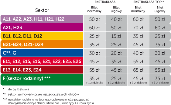 Bez zmian pozostaje propozycja dla rodzin, dla których przeznaczony jest liczący blisko 2000 miejsc sektor rodzinny, znajdujący się na trybunie F. Z biletu na sektor rodzinny może korzystać opiekun z dzieckiem do 13. roku życia. Na jednego opiekuna może przypadać maksymalnie dwoje dzieci, które również będą miały do dyspozycji swoje miejsca siedzące. Jeżeli opiekunem jest osoba mająca uprawnienia do zniżki, to wtedy może zakupić bilet ulgowy. Uwaga: sprzedaż biletów na sektor rodzinny prowadzona jest wyłącznie w Strefie Kibica.