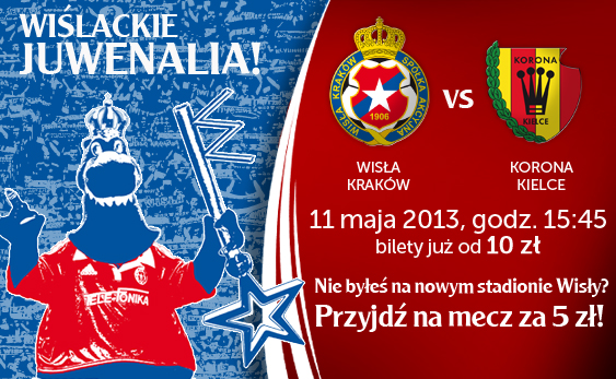 Bilety na mecz z Koroną będzie można kupować od poniedziałku od godz. 11:00 na stronie bilety.wisla.krakow.pl, natomiast w Strefie Kibica bilety można kupować od soboty 4 maja od godz. 10:00. Bilety przez internet można nabywać przez całą dobę, natomiast w Strefie Kibica sprzedaż prowadzona jest w soboty i niedziele między 10:00 a 16:00 oraz w dni powszednie od 11:00 do 20:00. Uwaga! Sprzedaż biletów przez internet zakończy się w piątek 10 maja o godz. 20:00.