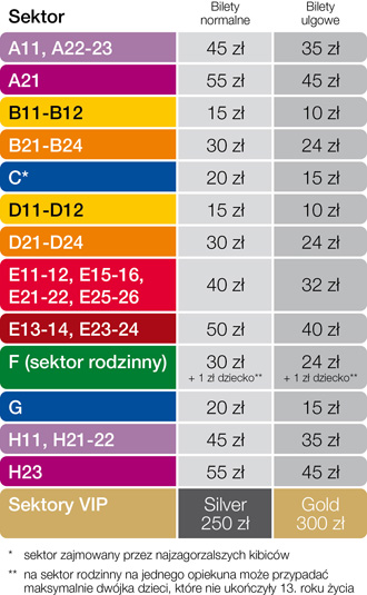 Bez zmian pozostaje również propozycja dla rodzin, dla których przeznaczony jest sektor rodzinny znajdujący się w narożniku stadionu na trybunie F i liczący blisko 2000 miejsc. Z biletów rodzinnych może korzystać opiekun z dzieckiem do 13. roku życia. Na jednego opiekuna może przypadać maksymalnie dwójka dzieci, które również będą miały do dyspozycji swoje miejsca siedzące. Jeżeli opiekunem jest osoba mająca uprawnienia do zniżki, to wtedy może zakupić bilet ulgowy.
