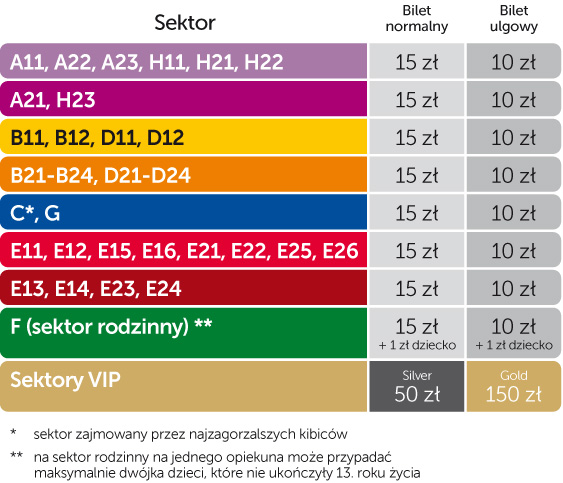 Bez zmian pozostaje również propozycja dla rodzin, dla których przeznaczony jest sektor rodzinny znajdujący się w narożniku stadionu na trybunie F i liczący blisko 2000 miejsc. Z biletów rodzinnych może korzystać opiekun z dzieckiem do 13. roku życia. Na jednego opiekuna może przypadać maksymalnie dwójka dzieci, które również będą miały do dyspozycji swoje miejsca siedzące. Jeżeli opiekunem jest osoba mająca uprawnienia do zniżki, to wtedy może zakupić bilet ulgowy.