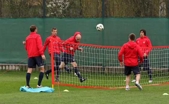 Tuż po godz. 11:00 osiemnastu zawodników pojawiło się na boisku bocznym przy Reymonta 22. Po rozgrzewce zostali podzieleni na dwie grupy. Jedna grała w siatkonogę, a druga w tym czasie ćwiczyła różne warianty rozegrania rzutów rożnych oraz rzutów wolnych. Przy tych drugich elementach gry trener Bahr zarządził mały konkurs: jeśli strzelający zawodnicy w jednej serii przynajmniej dwa razy pokonają bramkarza, wtedy on wykona 10 pompek. Jeśli nie – wtedy to ćwiczenie robią piłkarze z pola.