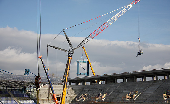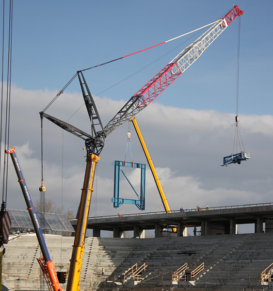 Do wyniesienia wszystkich tych materiałów na najwyższy poziom trybuny służyć będą dwa nowe dźwigi. Jeden z nich zlokalizowano za trybuną, drugi, większy, w środku stadionu.