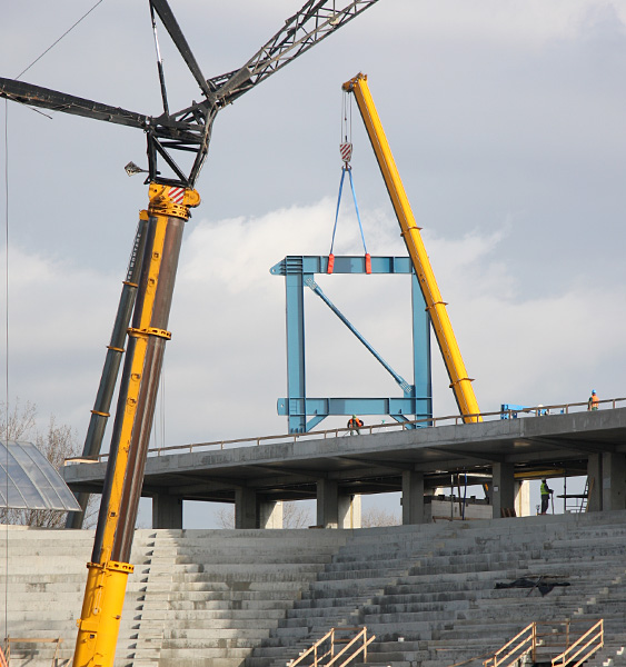 Montaż każdej z ram trwać będzie jeden dzień. Dopiero więc za miesiąc do stropu trybuny przytwierdzone zostaną wszystkie elementy, które tworzą niejako kręgosłup dachu. Do nich będą dołączane kolejne części dachu, a także elementy oświetlenia.