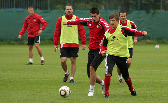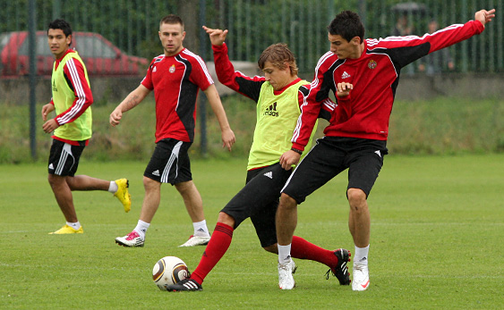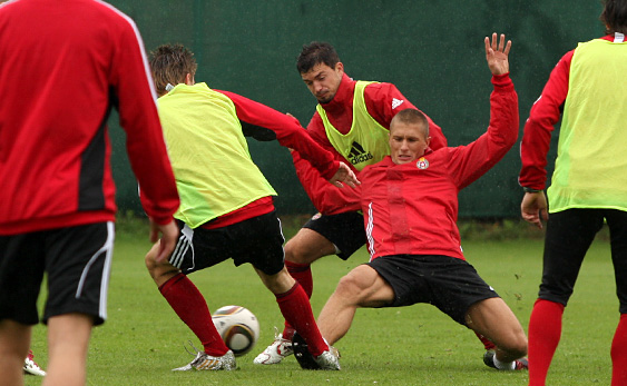 Po odprawie wszyscy wyszli na boisko boczne, gdzie w padającym deszczu trenowali przez półtorej godziny. W padającym deszczu zawodnicy rozegrali gierkę na cztery bramki, a następnie, podzieleni na dwie grupy, ćwiczyli stałe fragmenty gry. Po jednym z rzutów rożnych efektownym golem z przewrotki popisał się Eirk Cikos.
