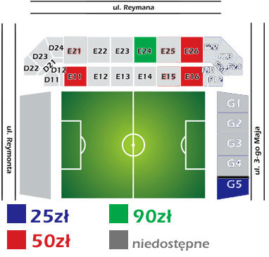 Poniżej znajduje się mapka trybuny stadionu, na której zaznaczone są ceny wejściówek na poszczególne sektory.