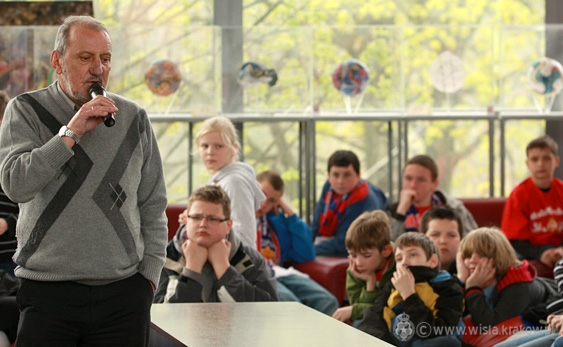 W sali konferencyjnej gościł również Adam Musiał – były zawodnik Wisły Kraków i reprezentacji Polski, a obecnie pracownik klubu. Pan Adam, z właściwą sobie bezpośredniością, opowiadał o swoich piłkarskich wspomnieniach. Przyznał się do spowodowania rzutu karnego w słynnym meczu Anglia – Polska, rozegranym na stadionie Wembley w 1973 roku, który biało-czerwoni zremisowali 1:1. Taki wynik dawał Polakom awans na Mistrzostwa Świata. „Jechaliśmy do jaskini lwa, nikt nie dawał nam żadnych szans, ale jednak w sporcie wszystko jest możliwe. Kiedy na stadionie rozległ się Mazurek Dąbrowskiego, Anglicy zaczęli gwizdać. Nie zdawali sobie sprawy, że jak Polakowi ktoś nadepnie na odcisk, to Polak się zmobilizuje. Każdy z nas pomyślał: „Poczekajcie, my wam tu pokażemy, co znaczy Polska”. I udowodniliśmy, że te gwizdy jeszcze bardziej nas zmotywowały i dodały nam skrzydeł” – mówił. Pan Adam przywołał jeszcze mecz z Niemcami, rozegrany w czasie MŚ w 1974 roku u naszych zachodnich sąsiadów. W „meczu na wodzie” z gospodarzami turnieju Polacy przegrali 0:1 i nie awansowali do wielkiego finału, który wygrała niemiecka drużyna. „Na kolacji pożegnalnej Niemcy podeszli do naszych stolików i oddawali nam swoje medale, mówiąc, że byliśmy lepsi od nich” – wspominał Adam Musiał, który opowiadał jeszcze między innymi o różnicach między ówczesną piłką nożną a dzisiejszą i o tym, kto według niego jest najlepszym piłkarzem Wisły Kraków.