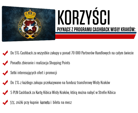 Nie masz jeszcze nowej Karty Kibica Wisły Kraków? Zapraszamy TUTAJ! Dzięki nowej Karcie Kibica z funkcją cashback przy zakupie karnetów otrzymujesz 5% zwrotu! Dodatkowo za każdą taką transakcję 1% sumy wydanych pieniędzy przekazywany jest na fundusz transferowy klubu. A to jeszcze nie wszystko! Każdorazowo otrzymasz także Shopping Points, które będziesz mógł wykorzystać na oferty specjalne na stronie cashback.wisla.krakow.pl.
