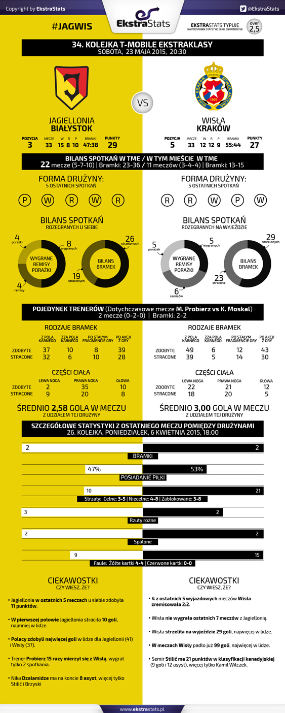 Data publikacji: 23-05-2015 14:01Podopieczni Kazimierza Moskala w dzisiejszym meczu zmierzą się z zespołem Jagielonii Białystok. Co mówią statystyki przed tym meczem? O tym możecie przekonać się poniżej.