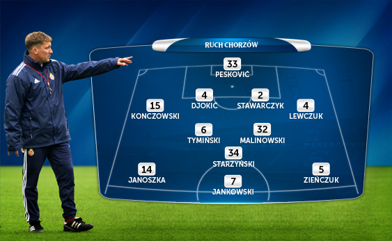 Pomoc: W ostatnim meczu wyjazdowym Ruch zagrał w systemie 1-4-5-1 (remis 4-4 z Lechią Gdańsk), a w meczu domowym, przegranym z Pogonią Szczecin, w systemie 1-4-4-2. Wydaję się, że chorzowianie znowu wystąpią z zagęszczonym środkiem pola i będą upatrywać goli po wygrywaniu pojedynów w środkowej strefie. W tym wypadku na lewej stronie zagra znany z występów w Wiśle Marek Zińczuk, a po przeciwnej stronie Łukasz Janoszka. Jako defensywni zagrają Marcin Malinowski i Łukasz Tymiński, a w roli ofensywnego pomocnika zobaczymy Filipa Starzyńskiego. W wypadku gry dwójką napastników na skrzydle może zamiast Janoszki pojawić się Pavol Sultes, a Janoszka partnerowałby Maciejowi Jankowskiemu na szpicy.
