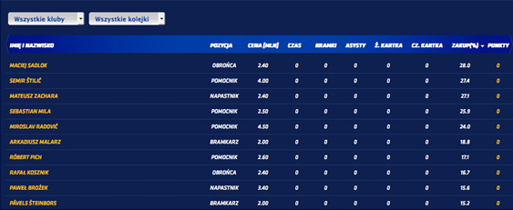 Dzięki możliwości wyboru klubu, któremu kibicujemy, uczestnicy Fantasy Ekstraklasy będą mogli zmierzyć się z innymi kibicami swojego klubu w oddzielnej klasyfikacji. Oprócz tego, każdy może stworzyć ligę prywatną, do której zaprosi wybranych znajomych. Do tej pory najwięcej drużyn stworzyli sympatycy Legii Warszawa, a najmniej Piasta Gliwice. Kogo najczęściej wybierają internetowi trenerzy? Poniżej lista dziesięciu najchętniej kupowanych do tej pory zawodników.