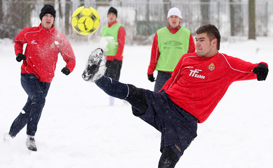 Drugą część zajęć stanowiła gierka na zaśnieżonym boisku treningowym. Kilkucentymetrowa warstwa śniegu sprzyjała wykonywaniu efektownych wślizgów i oddawaniu strzałów z powietrza w bardzo wyszukany sposób. Po kilku z nich, gdy piłka trafiała w poprzeczkę lub słupek jednej z bramek, w powietrze unosiły się tumany śniegu.