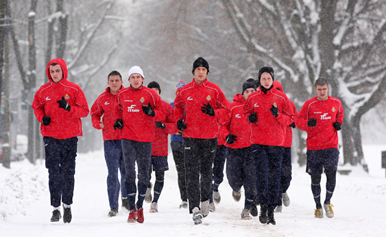 Pierwsze zajęcia Młoda Wisła zaczęła na krakowskich Błoniach. Po krótkiej rozgrzewce drużyna ruszyła okrążyć dwa razy całe Błonia. Kolegów z drużyny szybko w tyle zostawił Bartosz Rosłoń, który uporał się z kolejnymi kontuzjami barku i normalnie zaczął przygotowania do rundy. W związku z tym jednak, że przez wiele ostatnich miesięcy Rosłoniowi w utrzymaniu formy pomagało właśnie bieganie, to teraz pokonywanie długich dystansów przychodzi mu dużo łatwiej niż jego kolegom.