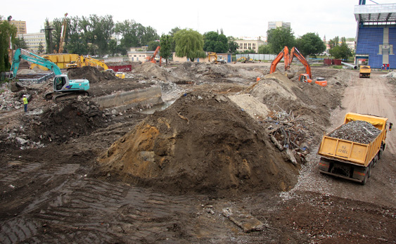 Po przeciwnej stronie, siedem maszyn robi wykopy pod fundamenty trybuny zachodniej. Część ciężkiego sprzętu kruszy elementy starych fundamentów, zaś koparki ładują ziemię na ciężarówki i wywożą ją poza obręb placu budowy. By ułatwić podjazd ciężarówek zostało zerwanych kilka pasów murawy i otrzymany teren zaadaptowano na bitą drogę dla samochodów.