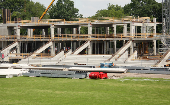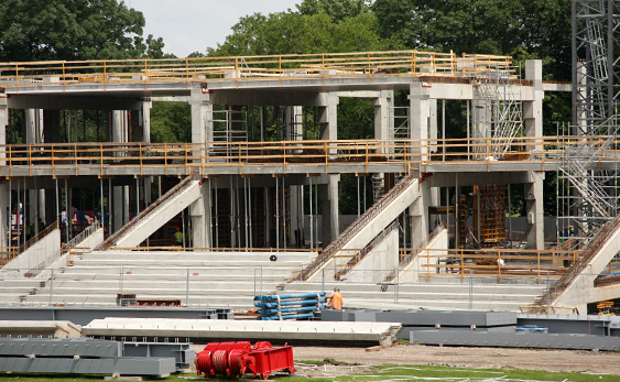 Prace budowlane na trybunie wschodniej koncentrują się wokół położenia poprzecznych, betonowych belek na pierwszej kondygnacji. Belki będą stanowić podstawę pod instalację krzesełek. Tutaj kluczową rolę odgrywa ogromny, żółty żuraw, który odpowiedzialny jest za przenoszenie najcięższych elementów na placu budowy. Ponadto, maszyna przenosi inne metalowe części konstrukcyjne na wyższą kondygnację trybuny, bowiem prace prowadzone są równolegle na obu poziomach.