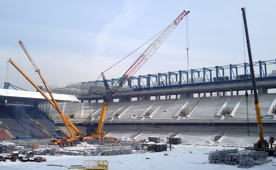 Sytuacja wygląda inaczej na trybunie wschodniej, gdzie montaż dachu nie jest uzależniony w takim samym stopniu od warunków atmosferycznych. Dzięki temu zamontowany został już trzeci segment oraz element zewnętrzny od strony ulicy Reymonta.