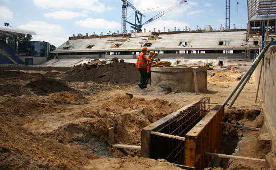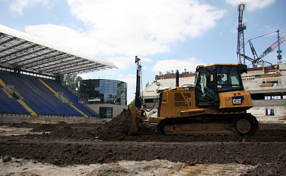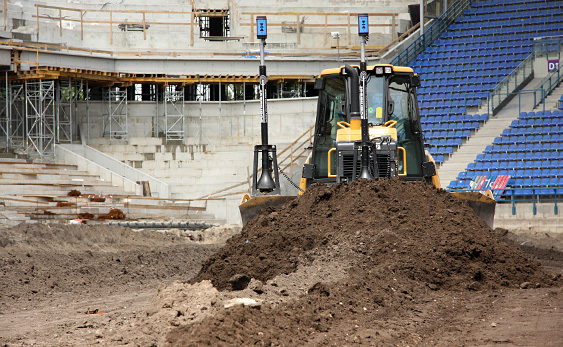 Na razie przywożona i rozprowadzana po całym terenie jest ziemia, która stanowić będzie najniższą warstwę nowej murawy. Przy okazji cały teren zostanie odpowiednio wypoziomowany. Całość terenu nie będzie płaska, lecz swoim kształtem przypominać będzie kopertę. Najwyższym punktem jest środek boiska, z którego teren spada w kierunku narożników, które z kolei są położone najniżej. Oczywiście różnica poziomów między środkiem boiska a narożnikami jest minimalna, więc gołym okiem nie będzie dostrzegalna.