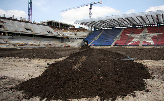 W warstwie ziemi, która układana jest teraz, położone zostaną rurki drenażu murawy. Nad tą warstwą ułożona zostanie kolejna – filtracyjna, a powyżej niej z kolei ułożone będzie ogrzewanie. Powyżej wysypana zostanie kolejna warstwa filtracyjna, a nad nią ziemia, która znajdować się będzie tuż pod murawą. Na sam koniec zostanie przywieziona właściwa murawa.