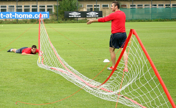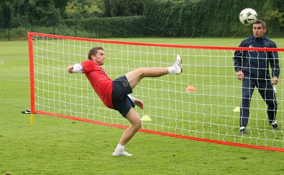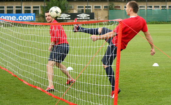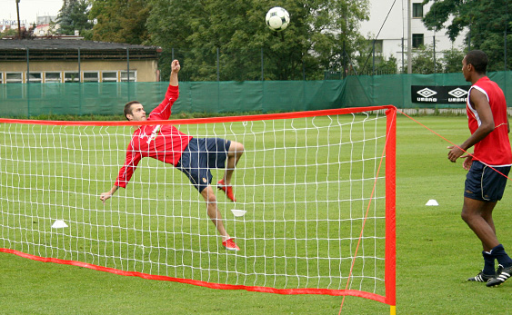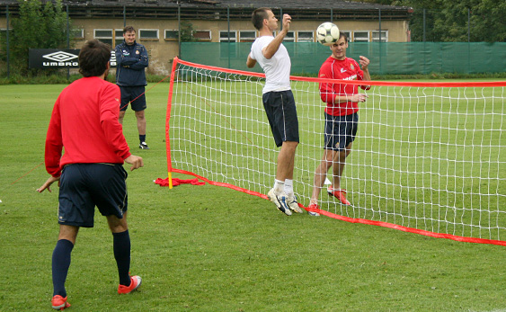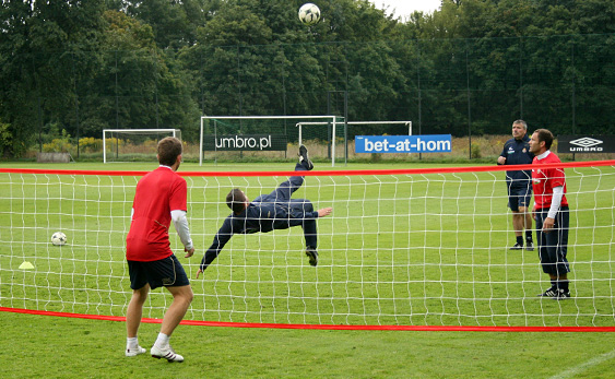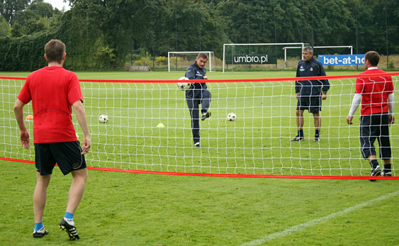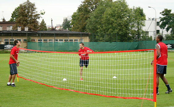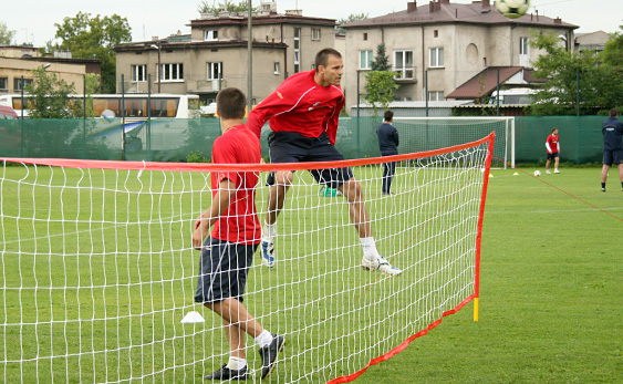 Starsi zawodnicy tymczasem przez dłuższy czas grali w siatkonogę. Arkadiusz Głowacki, który po rozcięciu głowy nadal trenuje z plastrem na głowie, bez skrupułów uderzał mocno piłkę głową, więc wygląda na to, że szwy mu nie przeszkadzają. W związku z tym, że z zawodników udało się utworzyć tylko trzy drużyny, jeden zespół zagrał z drużyną trenerów: Andrzeja Bahra, Rafała Janasa i Ryszarda Czerwca. Przestawiciele sztabu szkoleniowego wcale nie byli skazani na porażkę w tym meczu.