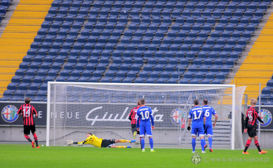Pierwsza połowa pojedynku Wisły z Eintrachtem należała do gospodarzy i to oni stworzyli sobie więcej okazji podbramkowych. Pierwszą akcję na bramkę rywale zamienili po kwadransie gry, kiedy to Djapka z dużej odległości dośrodkował wprost do Meiera, który mocnym strzałem w róg pokonał Gerarda Bieszczada. W 34. minucie meczu ponownie gola strzelił Meier pewnie wykorzystując rzut karny podyktowany przez arbitra za faul Arkadiusza Głowackiego na Aingerze.