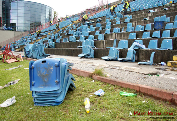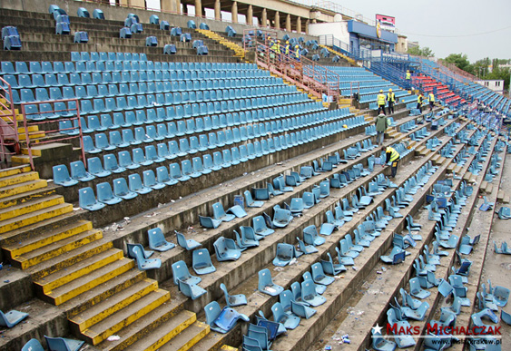 Jednocześnie na trybunie A rozpoczął się demontaż krzesełek. Robotnicy zdejmują również z sektora A i B barierki, odgradzające sektor od boiska.