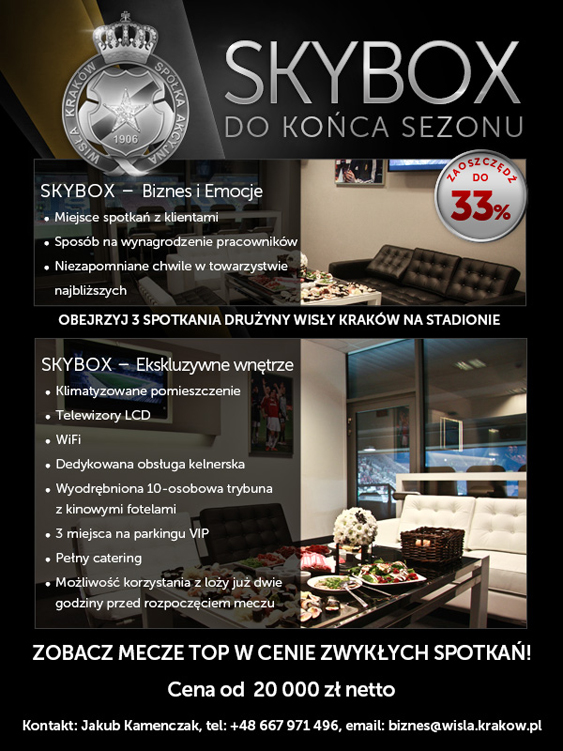 Już od 20 000 zł netto będą Państwo mogli wynająć Skybox na najważniejsze mecze sezonu 2014/2015 na Stadionie Miejskim im. Henryka Reymana! Wisła w tych meczach zmierzy się z Górnikiem Zabrze, Pogonią Szczecin oraz Śląskiem Wrocław!