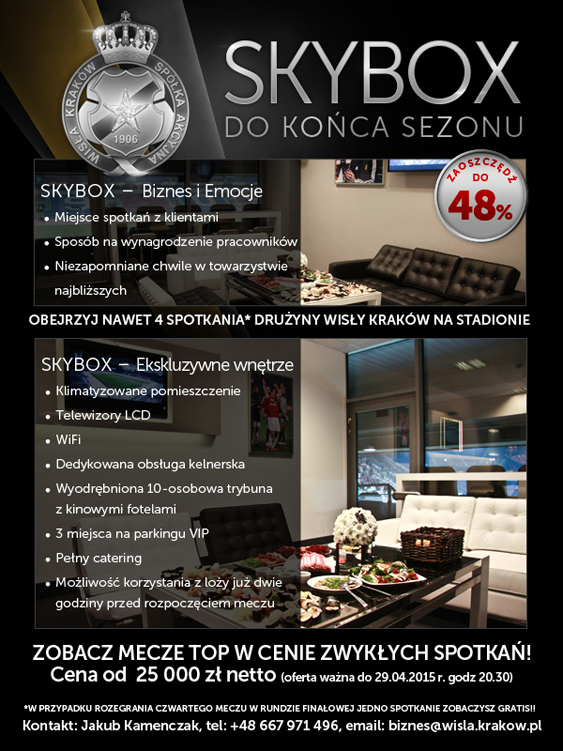 Cena promocyjna za wynajem Skyboxu na rundę finałową obowiązuje tylko do środy 29 kwietnia do godz. 20.30. W przypadku rozgrywania przez Wisłę Kraków czterech spotkań przy Reymonta 22 jeden z meczów zobaczycie Państwo gratis!