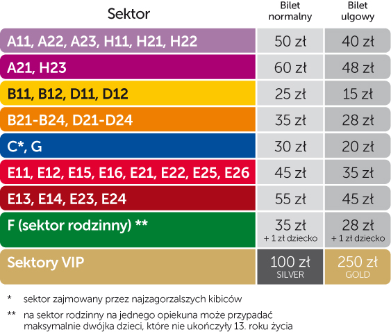 Bez zmian pozostaje również propozycja dla rodzin, dla których przeznaczony jest sektor rodzinny znajdujący się w narożniku stadionu na trybunie F i liczący blisko 2000 miejsc. Z biletów rodzinnych może korzystać opiekun z dzieckiem do 13. roku życia. Na jednego opiekuna może przypadać maksymalnie dwójka dzieci, które również będą miały do dyspozycji swoje miejsca siedzące. Jeżeli opiekunem jest osoba mająca uprawnienia do zniżki, to wtedy może zakupić bilet ulgowy.