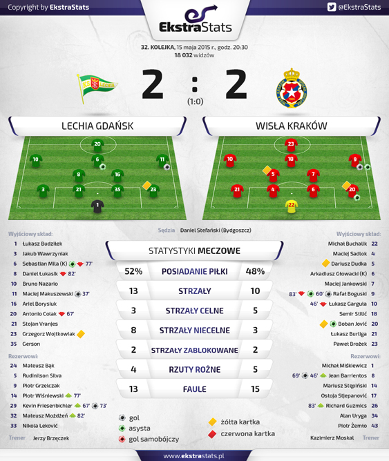 Data publikacji: 15-05-2015 23:17Biała Gwiazda zremisowała w meczu 32. kolejki T-Mobile Ekstraklasy w Gdańsku 2:2 z miejscową Lechią. Poniżej prezentujemy statystyki pomeczowe przygotowane przez Ekstrastats.pl