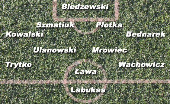 POMOC: Ta formacja przynajmniej pod względem personalnym prezentuje się dość ciekawie. Zawodnikami defensywnymi są Dariusz Ulanowski i Adrian Mrowiec. Mają skupić się na zabezpieczaniu linii obrony a także rozbijaniu ataków rywala w środkowej strefie boiska. To od nich w głównej mierze będzie zależało to, o czym wspominał trener Janas, czyli zagęszczanie środka pola. Pozwoli to na odzyskanie piłki i ewentualne przeprowadzenie kontraataku. Na pozycji prawego skrzydłowego może zagrać Przemysław Trytko. Dobrze czuje się również w ataku, ale ze swoimi warunkami fizycznymi raczej nie daje się do roli jedynego, wysuniętego napastnika. Być może trener Pasieka będzie chciał w pomocy wykorzystać jego szybkość i technikę. Drugim skrzydłowym jest Marcin Wachowicz, obdarzony dobrym wyszkoleniem techniczym i bardzo dobrą, lewą nogą. Wachowicz w czasie często schodzi do linii ataku i próbuje swojej szansy w strzałach z dystansu. Pablo Alvarez musi mieć go na uwadze, bo Wachowicz już zanotował w tym seoznie jedną bramkę. Na pozycji ofensywnego pomocnika może z powodzeniem zagrać Bartosz Ława. Jest kreatywnym piłkarzem, sporo widzi na boisku, celnie zagrywa i strzela z dystansu. Dodatkowym atutem Ławy jest zaangażowanie w grę defensywną.