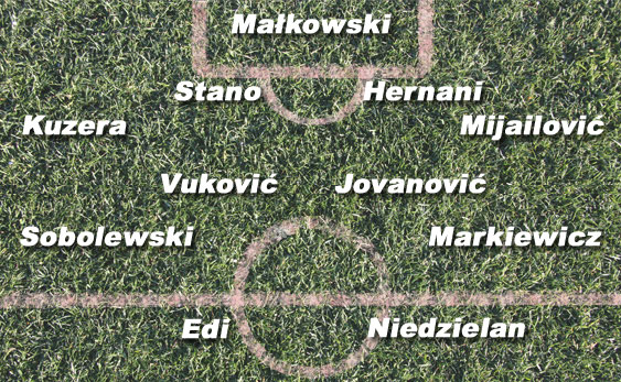 POMOC: Środek w drugiej linii tworzą Aleksandar Vukovic oraz Vlastimir Jovanovic. Serb i Bośniak stanowią doskonale uzupełniający się duet – Vukovic to ambitny walczak, który potrafi również świetnie rozgrywać piłkę i kreować grę zespołu, z kolei Jovanovic to gracz defensywny, który wykonuje tzw. „czarna robotę”. Jako prawy pomocnik może wystąpić Paweł Sobolewski – dynamiczny i dobrze wyszkolony technicznie zawodnik, który w bieżącej rundzie jest jednym z najlepszych asystentów w lidze. Po drugiej stronie pomocy możemy spodziewać się Jacka Markiewicza – piłkarza, który wspiera drużynę głównie doświadczeniem i zaangażowaniem.