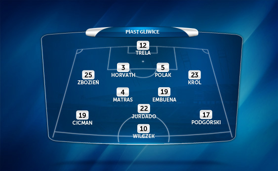 Piast jest kolejnym w lidze zespołem, zaczynającym przynajmniej na papierze w ustawieniu 1-4-2-3-1, choć np. w domowym meczu przeciwko Zawiszy Bydgoszcz w 4. kolejce ich ustawieniem był system 1-4-5-1. Parę defensywnych pomocników stanowią przeważnie Mateusz Matras i Carles, hiszpański zawodnik, który w ostatnim meczu zagrał pełne dziewiędziesiąt minut. W środku pola może również grać reprezentant Łotwy Artis Lazdins. Na prawej stronie mogą wystąpić zarówno Słowak Pavol Cicman, albo mający za sobą dwa spotkania w Ekstraklasie Bartosz Szeliga, który jest wypożyczony do drużyny popularnych “piastunek” z Sandecji Nowy Sącz. Lewa pomoc to pozycja kapitana Tomasza Podgórskiego, który dokładnie wykonuje stałe fragmenty gry w zespole z Gliwic. Ofensywnym pomocnikiem jest natomiast Ruben Jurado, który grał już na boku pomocy i w ataku w taktyce zespołu trenera Brosza. Po odejściu Marcina Robaka występuje na pozycji “10”.