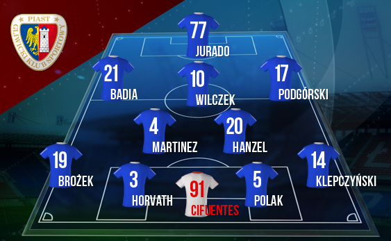 Atak: Jeśli nie przytrafi się nic niespodziewanego, to w ataku wystąpi najlepszy strzelec Piasta ubiegłego sezonu, czyli Ruben Jurado. W przypadku niekorzystnego wyniku trener może również posłać do boju świetnie radzącego sobie w powietrzu Tomasa Docekala.