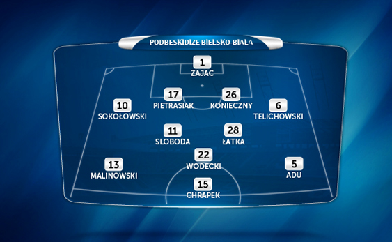 Pomoc: Trener Ojrzyński zapewne stwierdził, że nie warto przed końcem rundy zmieniać diametralnie taktyki bądź ustawienia zespołu, gdyż Podbeskidzie nadal gra według formuły: 1-4-2-3-1, czyli z dwoma defensywnymi pomocnikami przed linią obrony. Najczęściej są to Anton Sloboda i Dariusz Łatka. Większą rotację można zaobserwować w bardziej ofensywnej części pomocy. Jeśli można jeszcze stwierdzić, że Piotr Malinowski występuje przeważnie na prawej pomocy, to lewa flanka czy pozycja ofensywnego pomocnika powierzana jest różnym zawodnikom. W ostatnim meczu wystąpił tam Frank Adu Kwame. Ponadto na tej pozycji grał również Marcin Wodecki. Kolejnym kandydatem jest Aleksander Jagiełło. Trudno przewidzieć również, kto wybiegnie jako „dziesiątka”. Ustawiony tam poprzednio Adam Deja jest pomocnikiem bardziej defensywnym, mogło być to spowodowane taktyką meczów wyjazdowych. W spotkaniach u siebie Podbeskidzie jest ustawione bardziej ofensywnie. Drużyna zamyka tabelę, więc musi zdobywać więcej punktów niż remisową jedynkę. Prawdopodobieństwo bardziej ofensywnego ustawienia ma zatem realną szansę zaistnienia. Wariant ten może zapewnić Fabian Pawela, gdyż Maciej Iwański nadal nie może występować.