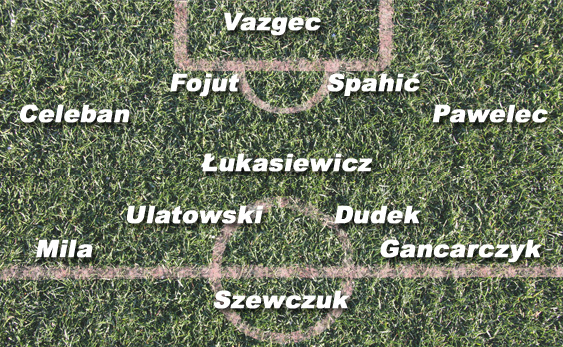 POMOC: Ryszard Tarasiewicz bardzo ciekawie zestawił drugą linię. Bardzo ważną rolę spełnia bowiem trójkąt piłkarzy operujących w środku pola, czyli Antoni Łukasiewicz – Krzysztof Ulatowski – Sebastian Dudek. Łukasiewicz przez wiele lat kariery grał jako środkowy obrońca, dlatego będzie dużą wagę przywiązywał do zabezpieczania tyłów zespołu i odbioru piłki w środkowej strefie boiska. Ulatowski i Dudek prawdopodobnie będą mieli bardzo podobne zadania, czyli angażowanie się w grę defensywną i tym samym zagęszczanie środka pola oraz skuteczny odbiór piłki. Obaj dobrze prezentują się też w ofensywie, potrafią celnie i dokładnie dograć do partnera, podchodzą wysoko pod bramkę rywala i szukają swojej szansy na celny strzał. Sporym znakiem zapytania jest obsadzenie pozycji prawego skrzydłowego. W meczu z Ruchem na tej stronie grał Sebastian Mila, ale często schodził do środka pola, wykorzystując swoją technikę i niezły przegląd pola. Mila z pewnością nie jest typem bocznego pomocnika, ale trener Tarasiewicz wskutek kontuzji Marka Gancarczyka być może ustawi na tej stronie boiska ponownie Milę, który jest niezwykle ważnym ogniwem Śląska. Po kartkowej absencji na lewe skrzydło wróci Janusz Gancarczyk, który jednak gdzieś zgubił formę, którą czarował rok temu. Trzeba mieć go na uwadze, bo nadal potrafi urwać się i dograć dokładną piłkę w pole karne, ale nie jest już tak zabójczo skuteczny.