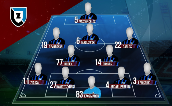 Atak: W ataku zagra szukający swojego ósmego trafienia w rozgrywkach Ekstraklasy drugi strzelec zespołu - Bernardo Vasconcelos. W odwodzie trenerowi Tarasiewiczowi pozostają: debiutant z Portugalii - Alvarinho oraz Paweł Abbott lub Paweł Wojciechowski.