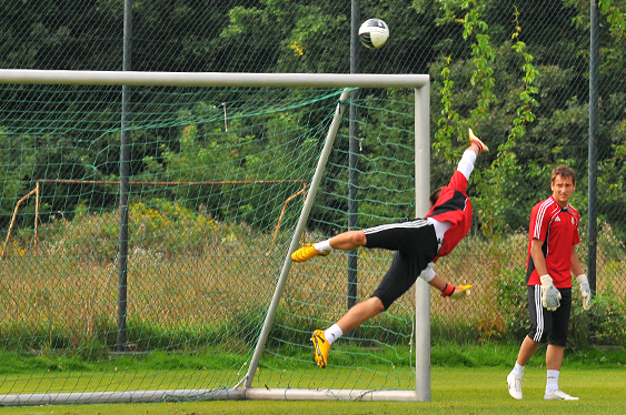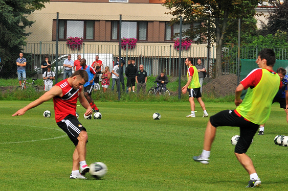 Po końcowym gwizdku trener zebrał wszystkich piłkarzy wokół siebie i przez kilka chwil jeszcze im coś tłumaczył. Mimo że trening się już zakończył, to zawodnicy zostali na murawie. Jedni trenowali strzały z rzutów wolnych i karnych, a inni grali między sobą.