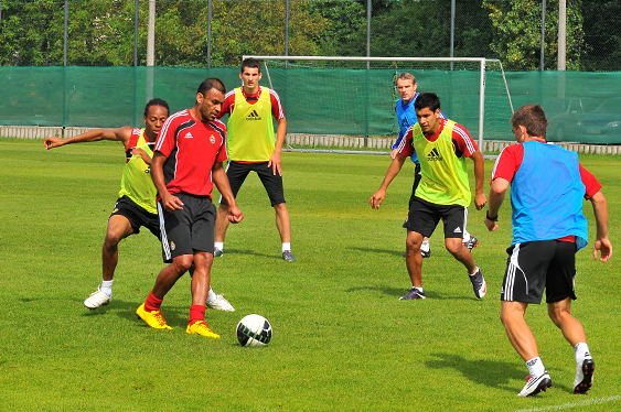 Trener Maaskant podzielił piłkarzy na dwie grupy. W każdej z nich byli zawodnicy z żółtymi i niebieskimi znacznikami oraz bez znaczników. Żółci i niebiescy wymieniali podania, a pozostali starali się im przerywać. Szkoleniowiec Białej Gwiazdy zatrzymywał w pewnym momencie grę i tłumaczył, jak w danej sytuacji zawodnicy powinni się zachowywać. Zachęcał ich również do wymiany podań z pierwszej piłki.