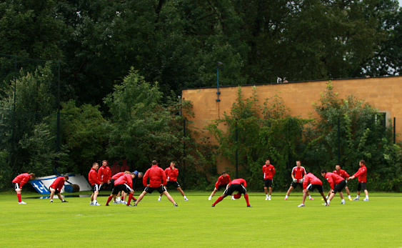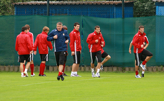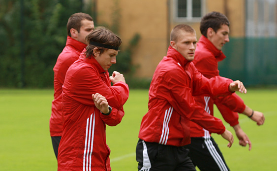 Zawodnicy na boisko boczne wyszli z niemal godzinnym opóźnieniem z powodu nawałnicy, jaka przeszła nad Krakowem. Piłkarze najpierw mieli lekką rozgrzewkę, a potem zostali podzieleni na dwie grupy. Ci, którzy grali we wczorajszym meczu w Baku, mieli rozbieganie, a ci, którzy nie wystąpili wcale lub krótko – rozegrali gierkę na połowie boiska.