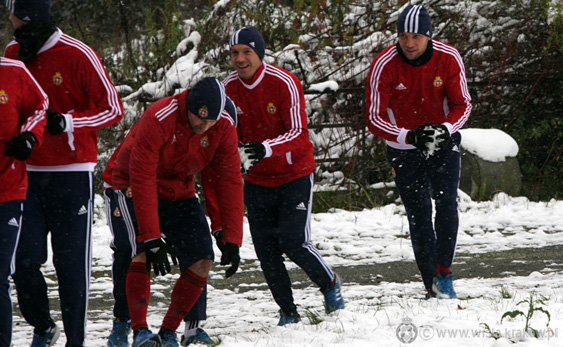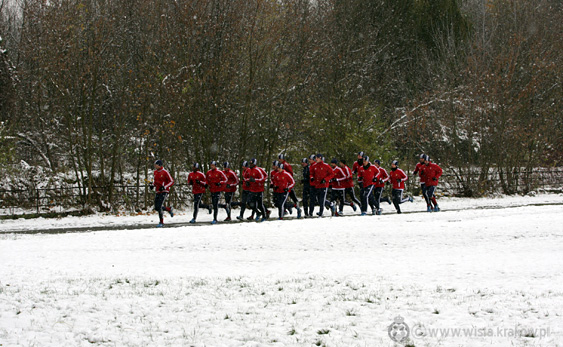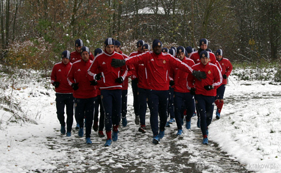 „Na poniedziałek mieliśmy akurat podobny plan do tego, jaki udało nam się zrealizować” – podsumował poniedziałkowe zajęcia szkoleniowiec Białej Gwiazdy, Tomasz Kulawik. Piłkarze najpierw około godziny spędzili na siłowni, a dopiero potem wyszli na zewnątrz. Na polu nie mieli jednak zaplanowanych zajęć z piłką, a jedynie rozbieganie. W śnieżnej aurze drużyna spędziła więc około pół godziny, pokonując kolejne okrążenia wokół boiska bocznego.