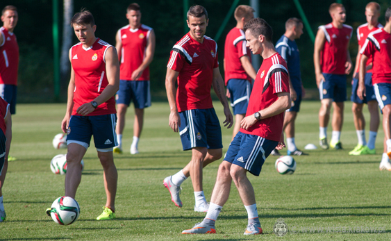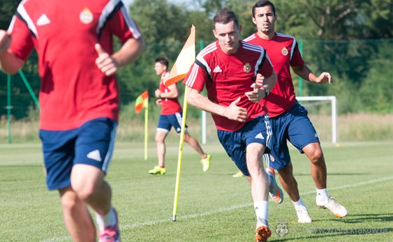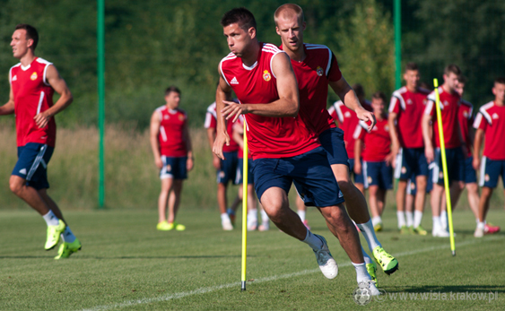 Gdy ostatnie zdjęcie zostało już zrobione, a boisko uporządkowano, trener Kazimierz Moskal rozpoczął wtorkowy trening. Ponieważ jutro rano Wiślacy rozegrają kolejny sparing, dzisiejsze zajęcia nie miały dużej intensywności, a ich przebieg skupił się na poprawie dynamiki.