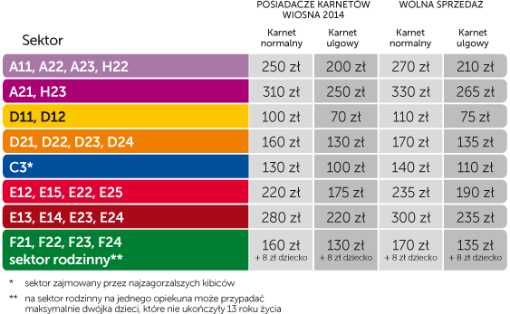 - ze sprzedaży karnetów wyłączone są sektory B, C1, C2, C4, C5, E11, E16, E21, E26, F11, F12, G2, G3, H11 oraz H21